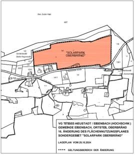 Die Verwaltungsgemeinschaft Titisee-Neustadt/Eisenbach hat am 31.10.2023 in öffentlicher Sitzung gemäß § 2 Abs. 1 Baugesetzbuch (BauGB) beschlossen, den Flächennutzungsplan (FNP) punktuell zum 16. Mal für das Gebiet des Bebauungsplanes „Solarpark Oberbränd“ zu ändern. Der Geltungsbereich hat eine Größe von ca. 9,0 ha und liegt nördlich der Oberbränder Straße (Kreisstraße 4993) und in der Nähe der östlichen Gemeindegrenze. der Gemeinde Eisenbach (Hochschwarzwald) im Ortsteil Oberbränd.